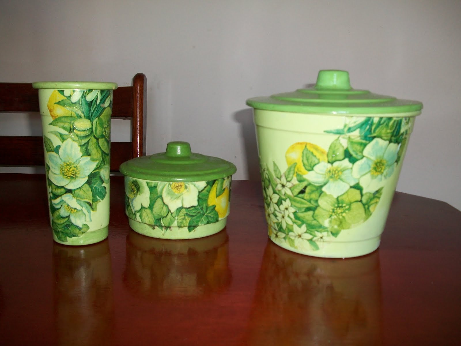 Gente!!!!!!!!!!!!!! Olha que mimo esse trio de cozinha com decoupage, você pode renovar o seu como eu fiz (pois o meu já estava usado), e é muito simples, (esse meu é em metal) se o seu trio for em plástico use a Tinta Primer na cor desejada espere secar bem e cole o guardanapo e depois passe Termolina Leitosa para impermeabilizar. Se for em metal só use o Primer se você quiser mudar a cor do seu trio senão cole só o guardanapo. Ficou fofo não? (só a fotógrafa que tem que melhorar!!!!) Beijos e até a próxima! Fátima